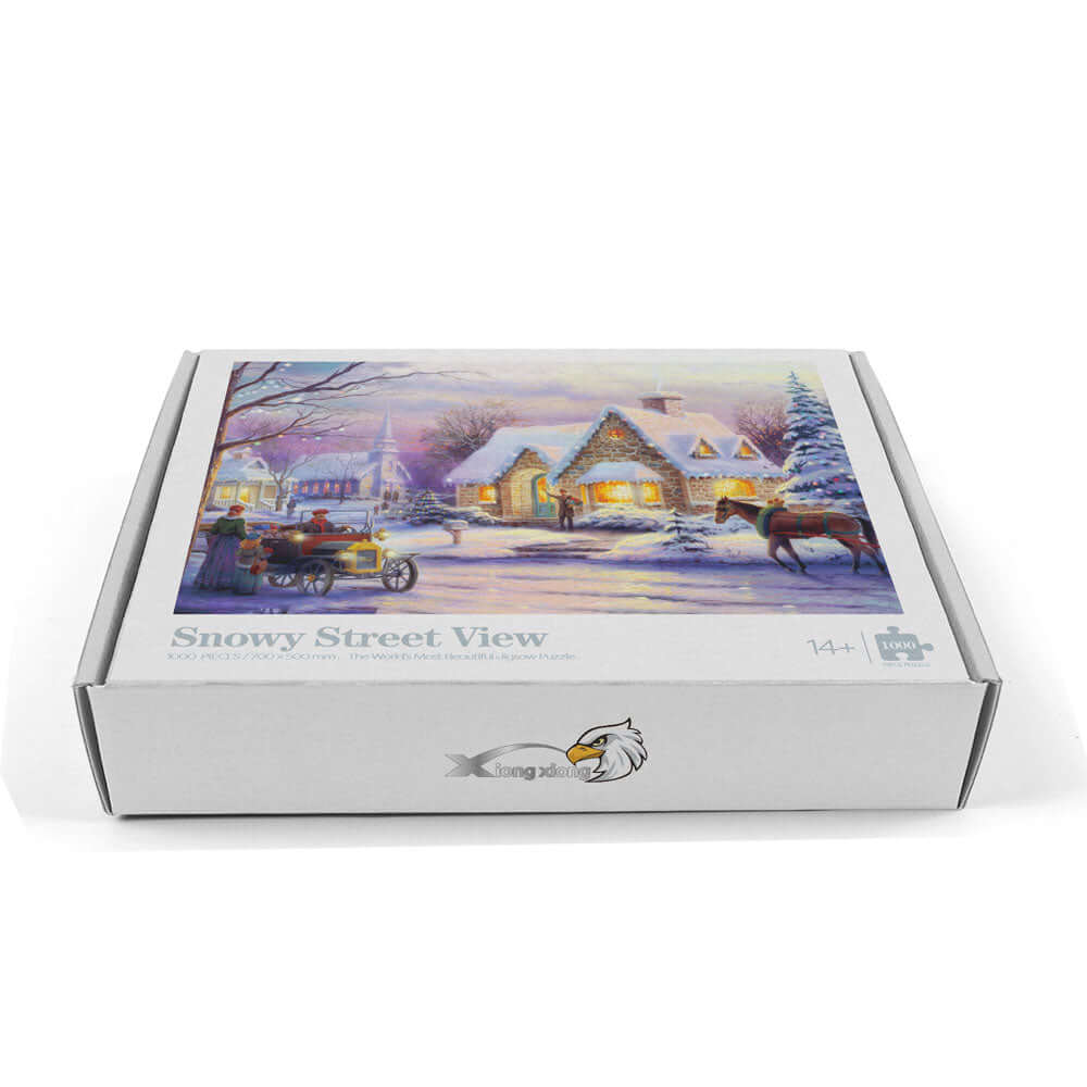 • Casse-tête en boîte de 1000 pièces avec vue sur la rue enneigée.