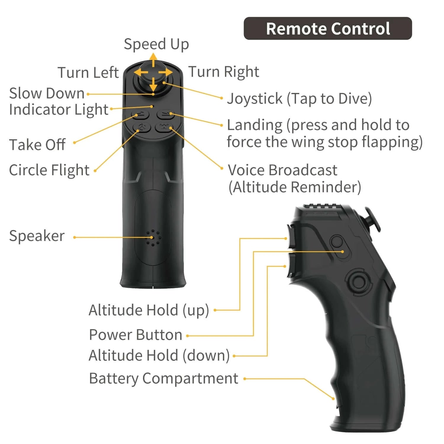• Appuyez sur le bouton d'atterrissage pour une descente contrôlée. Tenir pendant trois secondes après l'atterrissage pour arrêter le battement des ailes pour la sécurité.