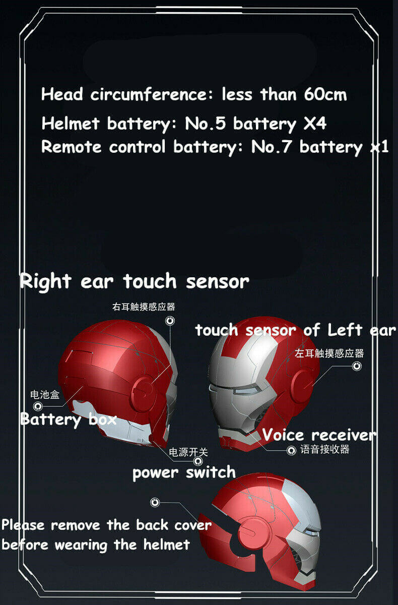 • Bruitage : Plongez dans l'expérience Iron Man avec des effets sonores authentiques qui donnent vie au casque, y compris la fonctionnalité d'ouverture et de fermeture emblématique.