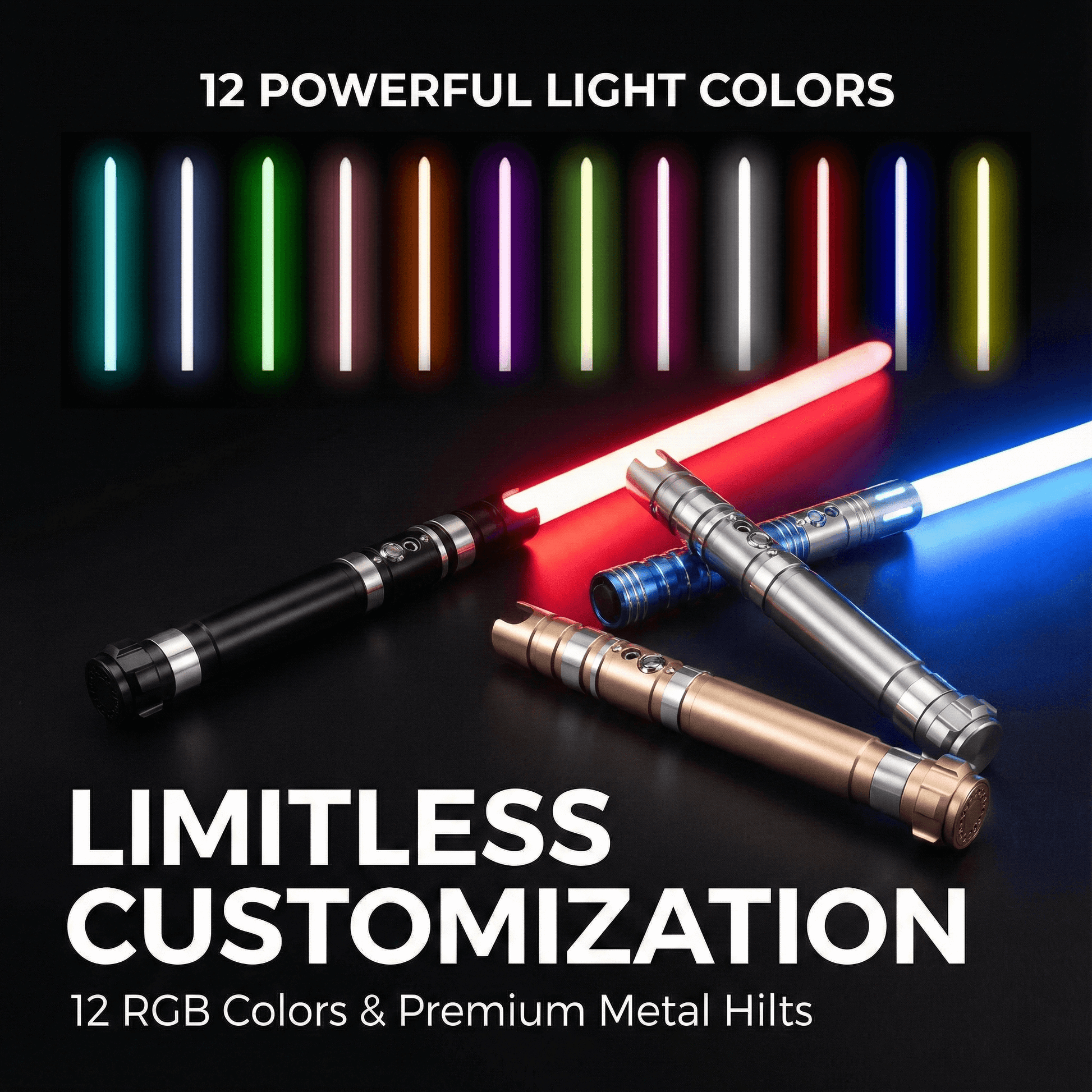 גלה את חרב האור האולטימטיבי RGB: ידית מתכת עמידה, 12 צבעים ואפקטים קוליים